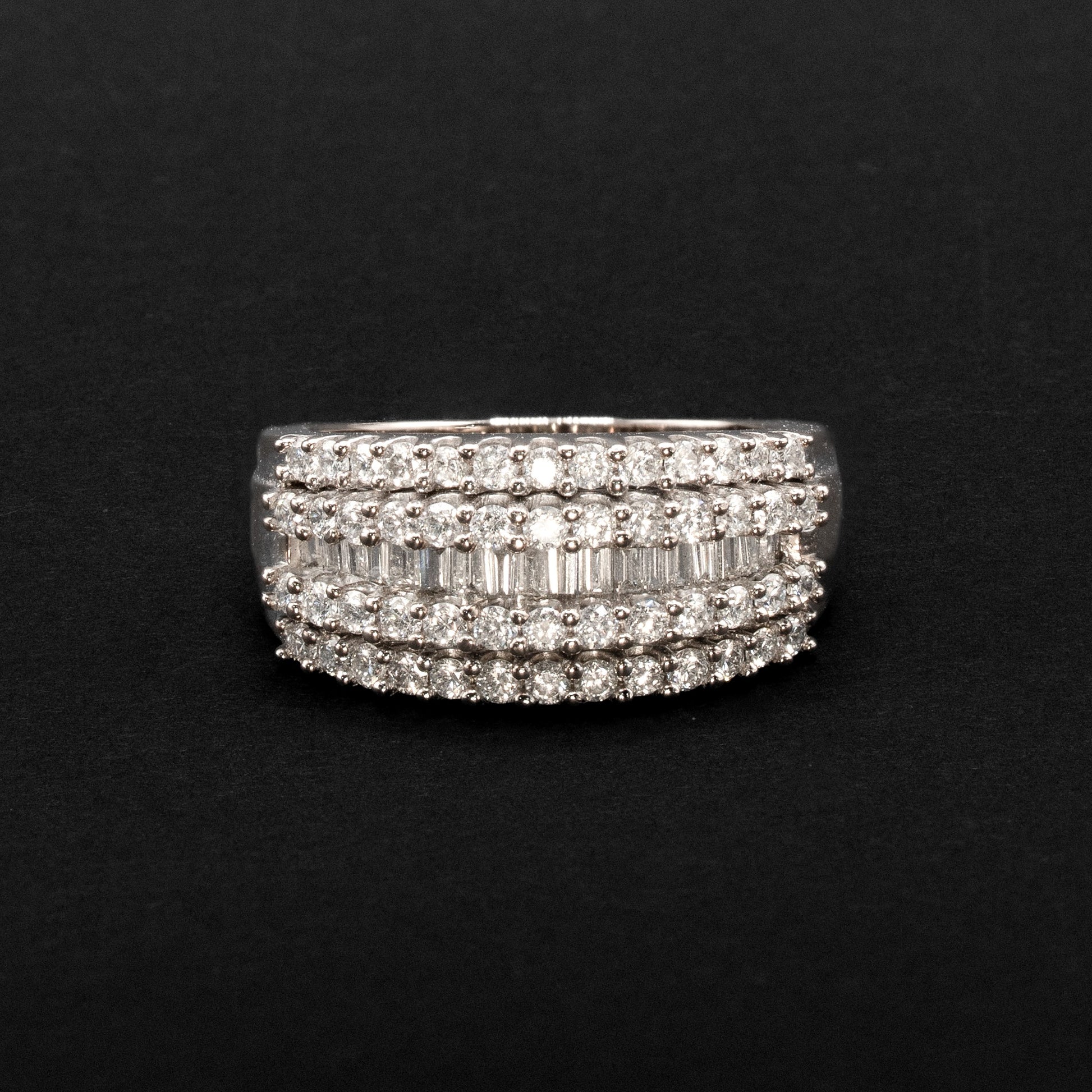 cette bague en or gris 18 carats réunit diamants ronds et baguettes dans un jeu de lumière fascinant.